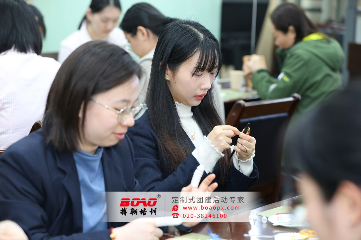在數(shù)字金融與智能服務(wù)快速迭代的今天,銀行團(tuán)隊(duì)需要時(shí)刻保持敏銳與高效。然而,搏翱廣州拓展培訓(xùn)公司深信,持續(xù)的高效源自內(nèi)心的寧?kù)o與團(tuán)隊(duì)的和諧。因此,我們選擇了“古風(fēng)首飾發(fā)簪”這一極具東方美學(xué)意蘊(yùn)與手作溫度的主題,作為此次團(tuán)建的載體。發(fā)簪,不僅是束發(fā)之器,更是貫穿中華千年文明的禮儀之物與情感信物,承載著“結(jié)發(fā)同心”的美好寓意。制作一枚發(fā)簪,從設(shè)計(jì)構(gòu)圖、選材配色,到繞線鑲嵌、組裝定型,每一步都需沉心靜氣,傾注巧思。這不僅僅是一項(xiàng)手工活動(dòng),更是一次對(duì)“慢工出細(xì)活”傳統(tǒng)匠心的深度體驗(yàn),一場(chǎng)在指尖流淌的團(tuán)隊(duì)美學(xué)共創(chuàng)。
