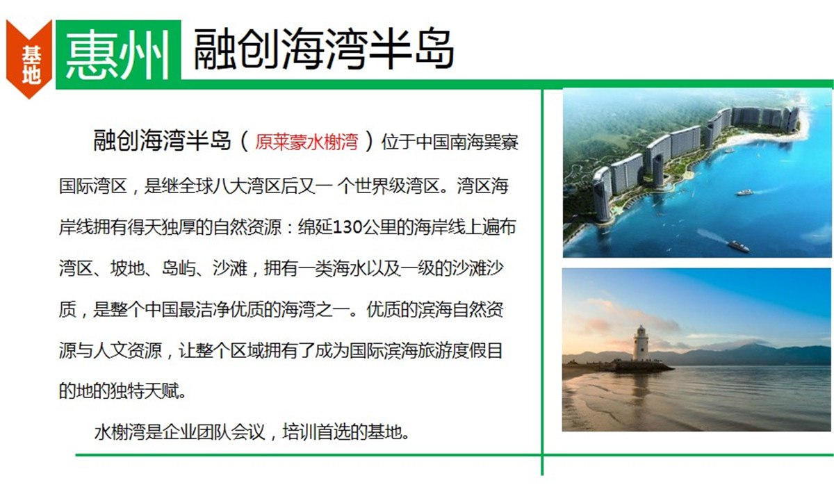 惠州海灣半島海邊拓展基地(原萊蒙水榭灣)位于中國南海巽寮國際灣區(qū),是繼全球八大灣區(qū)后又一個世界級灣區(qū)。灣區(qū)海岸線擁有得天獨(dú)厚的自然資源:綿延130公里的海岸線上遍布灣區(qū)、坡地、島嶼、沙灘,擁有一類海水以及一級的沙灘沙質(zhì),是整個中國最潔凈優(yōu)質(zhì)的海灣之一。優(yōu)質(zhì)的濱海自然資源與人文資源,讓整個區(qū)域擁有了成為國際濱海旅游度假目的地的獨(dú)特天賦。